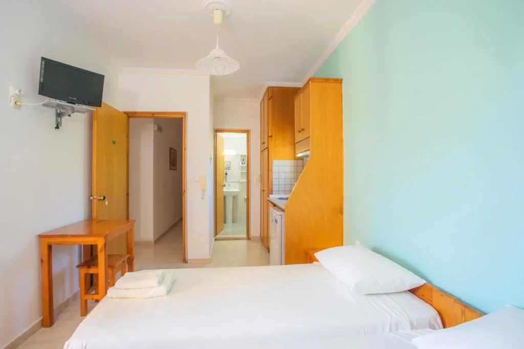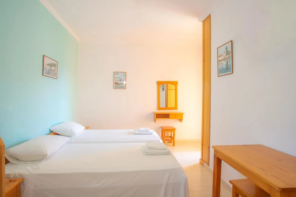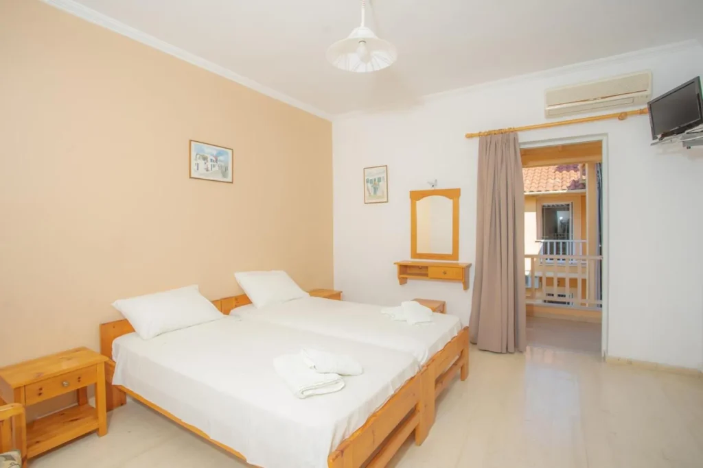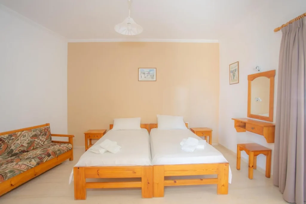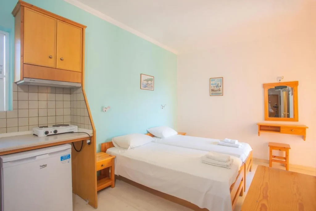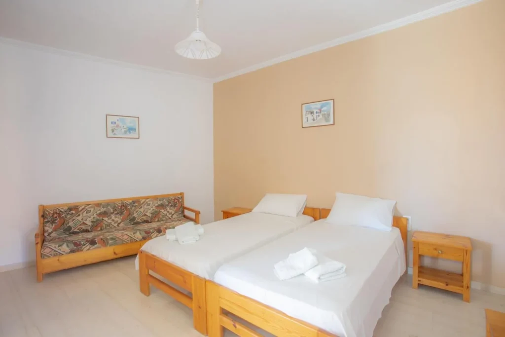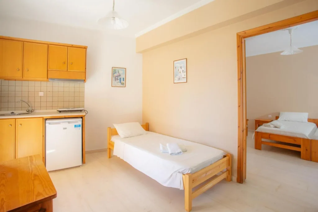 Τα διαμερίσματα είναι δίκλινα και τρίκλινα και όλα έχουν δικό τους μπαλκόνι. Βρίσκονται στον πρώτο και δεύτερο όροφο. Είναι διαθέσιμα από 15 Ιουνίου έως 30 Σεπτεμβρίου.